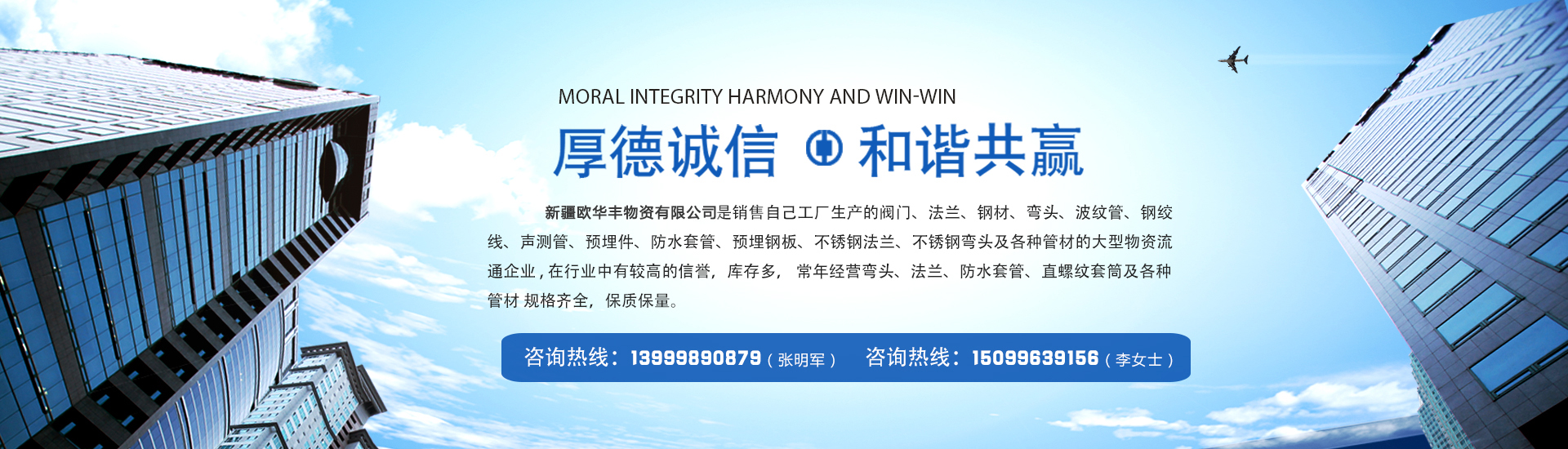 新疆歐華豐物資有限公司是銷售自己工廠生產的彎頭  法蘭  防水套管  及各種管材的大型物資流通企業 , 在行業中有較高的信譽,庫存多,常年經營閥門、法蘭、鋼材、彎頭、波紋管、鋼絞線、聲測管、預埋件、防水套管、預埋鋼板、不銹鋼法蘭、不銹鋼彎頭及各種管材 規格齊全,保質保量。 公司一貫以: 服務上乘、質量優質、價格合理、客戶至上、服務周到、讓利客戶、薄利多銷為原則,誠實守...